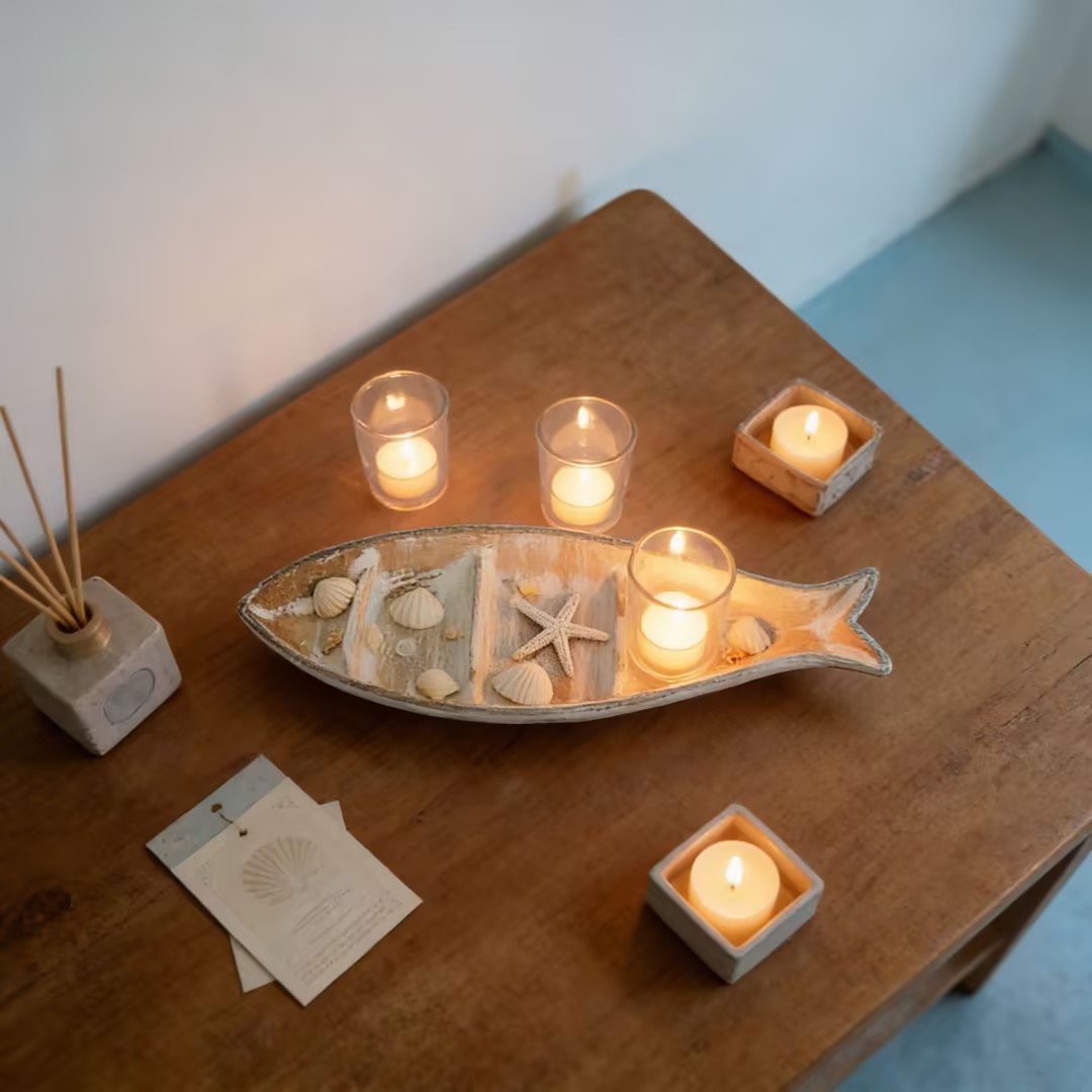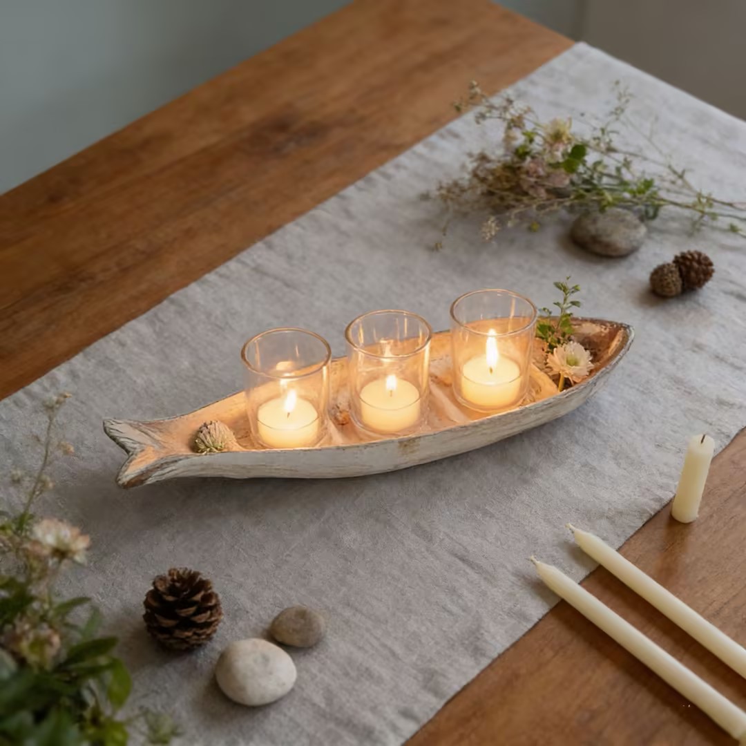 This beautiful wooden fish-shaped candle holder is the perfect decorative piece to enhance your living room, dining table, bedroom, hotel or B&B space.